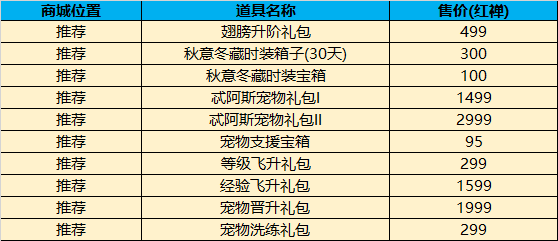 活动内容:活动期间,商城推荐栏将限时上架各类礼包,礼包奖励内容丰富,玩家可在商城内购买。