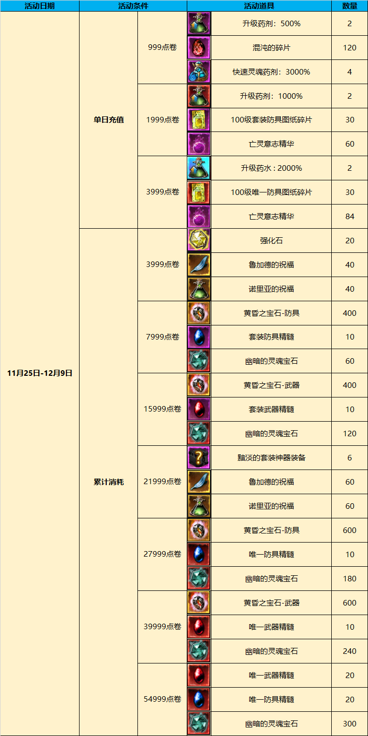 3. 11月25日10:00-12月9日23:59,玩家充值点卷或消耗点卷需要达到指定金额才可获得对应活动奖励,充值或消耗成功后奖励获取界面可能存在1-2分钟的延迟;