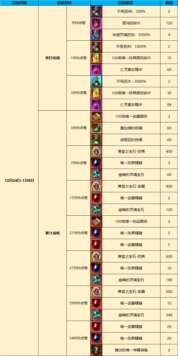 3. 12月24日10:00-1月6日23:59,玩家充值点卷或消耗点卷需要达到指定金额才可获得对应活动奖励,充值或消耗成功后奖励获取界面可能存在1-2分钟的延迟;