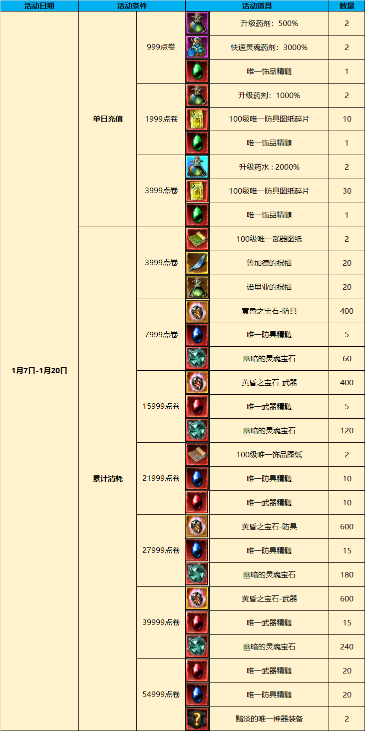 3. 1月7日10:00-1月20日23:59,玩家充值点卷或消耗点卷需要达到指定金额才可获得对应活动奖励,充值或消耗成功后奖励获取界面可能存在1-2分钟的延迟;