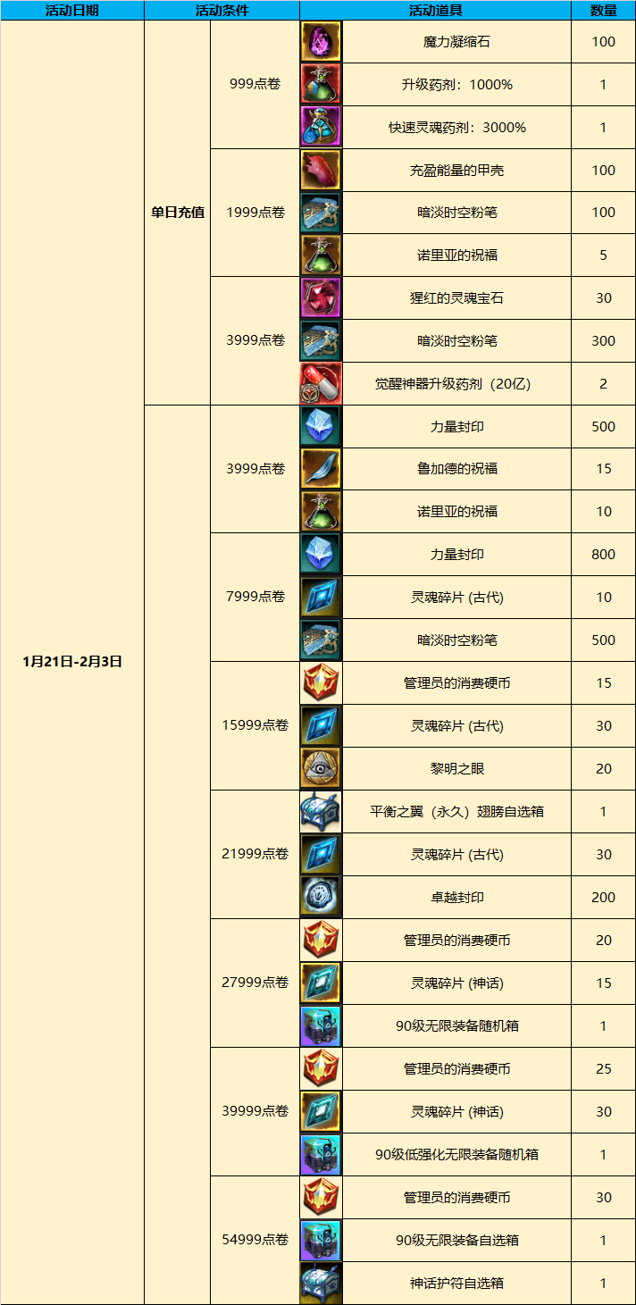 3. 1月21日10:00-2月3日23:59,玩家充值点卷或消耗点卷需要达到指定金额才可获得对应活动奖励,充值或消耗成功后奖励获取界面可能存在1-2分钟的延迟;