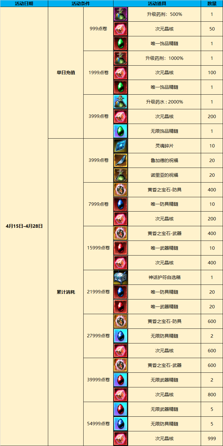 3. 4月15日10:00-4月28日23:59,玩家充值点卷或消耗点卷需要达到指定金额才可获得对应活动奖励,充值或消耗成功后奖励获取界面可能存在1-2分钟的延迟;